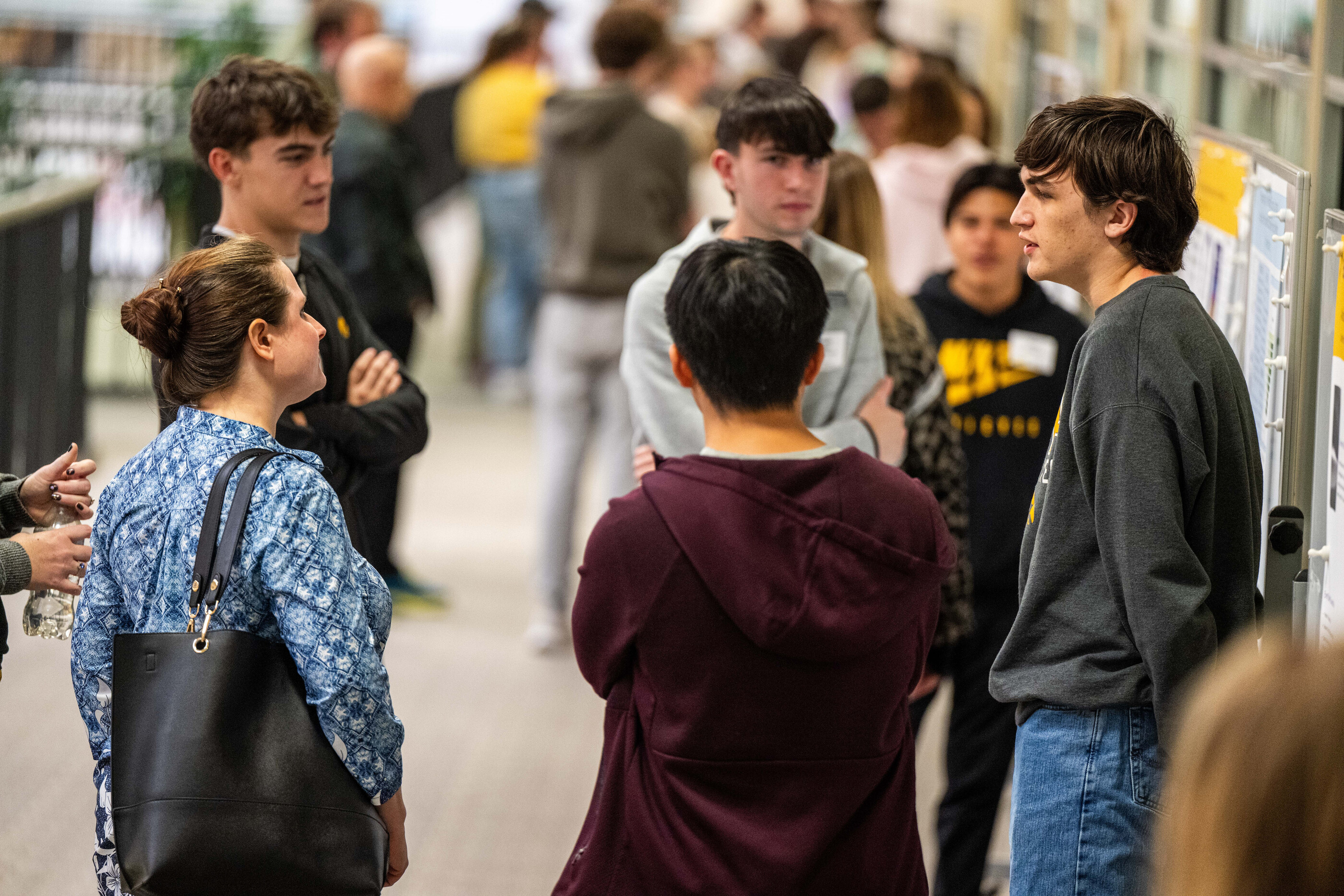 At a poster session, presenters share their work in the form of a large poster. Attendees can view each poster and speak with presenters about their findings. Poster sessions are common events for graduate students to participate in; the University of Iowa also holds poster sessions for undergraduates who are involved in research on campus. Being able to participate in a poster session as a first year, first semester student is an incredibly unique learning experience, and we are excited to offer this opportunity each fall.